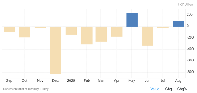 Tale risultato ha contribuito a ridurre il deficit cumulato nei primi otto mesi del 2025, portandolo a quota TL 907,6 miliardi.