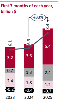Nei primi otto mesi del 2025, il disavanzo si è attestato a USD 15,854 mld, rispetto ai USD 7,998 mld registrati tra gennaio e agosto del 2024.