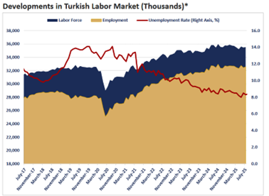 Turkstat, l’Istituto nazionale turco di statistica, ha reso noto lo scorso 1° ottobre che, nel mese di agosto 2025, il tasso di disoccupazione nel Paese si è attestato all’8,5% (pari a 3.044.000 persone), registrando un aumento di 0,4 punti percentuali rispetto al mese precedente.