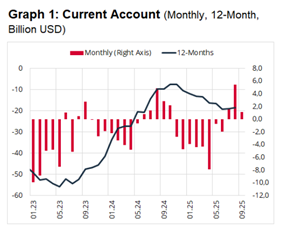 Secondo gli ultimi dati ufficiali resi noti dalla Banca Centrale turca (CBRT), lo scorso settembre la Turchia ha registrato un surplus di conto corrente (CAD) pari a USD 1,112 mld rispetto al surplus di USD 5,455 mld del mese precedente. Si tratta del terzo avanzo consecutivo, dopo una serie di disavanzi registrati tra novembre 2024 e giugno 2025.