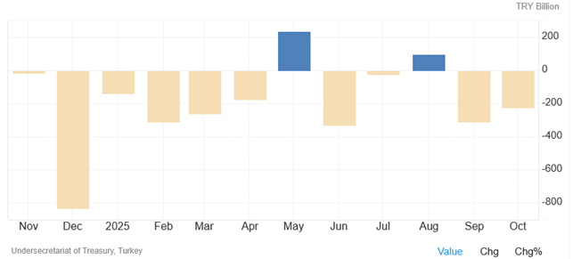 Tale risultato ha contribuito a far aumentare il deficit cumulato nei primi dieci mesi del 2025, portandolo a quota TL 1,440 trilioni, circa USD 34,4 mld, (+14,3% sui mesi gennaio-ottobre 2024), segnalando crescenti pressioni fiscali mentre le spese continuano a superare le entrate.