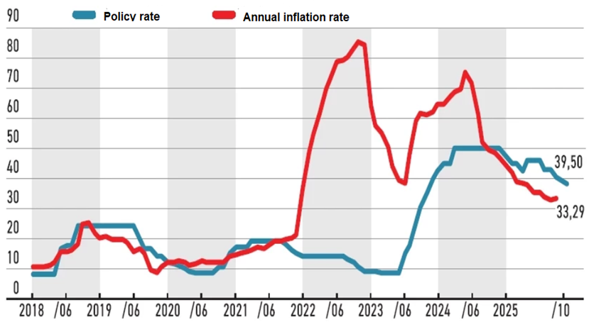 A settembre l’inflazione annua è risalita lievemente al 33,29%, interrompendo la lunga tendenza al ribasso iniziata a metà del 2024. In linea con i precedenti comunicati, la BCRT ha ribadito la propria determinazione a mantenere un orientamento monetario restrittivo fino al conseguimento della stabilità dei prezzi, evidenziando che tale approccio rafforzerà la disinflazione attraverso il canale della domanda, del tasso di cambio e delle aspettative d’inflazione. La Banca ha reiterato che l’orientamento monetario sarà irrigidito qualora le prospettive d’inflazione dovessero discostarsi in misura significativa dagli obiettivi.