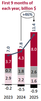 Nei primi nove mesi del 2025, il disavanzo si è attestato a USD 14,894 mld, rispetto ai USD 5,160 mld registrati tra gennaio e settembre del 2024.
