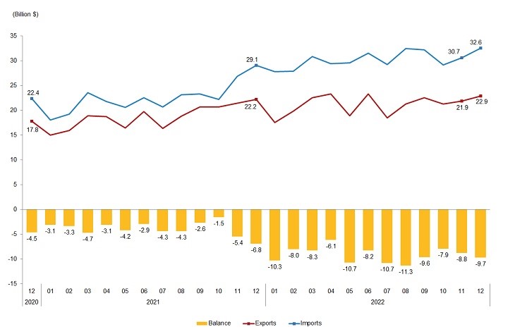 Nel 2022 il deficit commerciale è stato pari a 109,5 miliardi di dollari con un incremento sul 2021 del 137%.