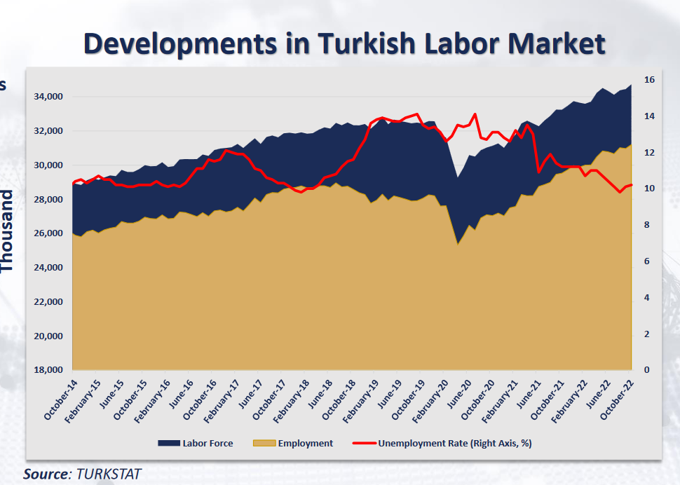 Nonostante la decelerazione dell'attività economica determinata dalla debolezza della domanda esterna, il mercato del lavoro in Turchia per tutto il 2022 ha avuto un graduale miglioramento, con una forza lavoro che ha raggiunto i 35,2 milioni di occupati, mentre il tasso di disoccupazione si è attestato al 10,2% dopo il 9,6% dell’ottobre 2022 (il più basso degli ultimi 9 anni). Tra i paesi OCSE, la Turchia ha mostrato i tassi i più alti di crescita dell’occupazione; inoltre il tasso di partecipazione femminile è stato il più alto di sempre nel Paese, attestandosi a dicembre scorso al 36,4%.