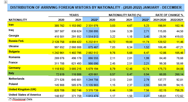 La stagione è stata vivace con una forte ripresa del numero di visitatori stranieri (+84,77% su base annua) dopo il crollo del 2020 dovuto alla pandemia da COVID-19; sostenuta dagli arrivi dei Paesi Europei che hanno consentito alla Turchia di tornare ai livelli pre-pandemia del 2019. I dati preliminari per il 2022 del Ministero del Cultura e del Turismo indicano, per al primo posto, e per la prima volta, la Germania (12,74% del totale) che scavalca la Russia (11,74%) che costituisce tuttavia ancora un ampio e prezioso bacino d’utenza per la Turchia.