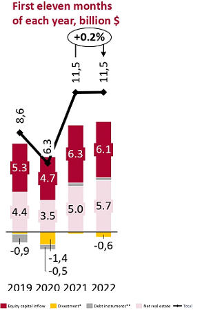 I dati i più aggiornati sui flussi di IDE in Turchia, pubblicati lo scorso 11 gennaio dall’Associazione non governativa degli Investitori Internazionali nel Paese (YASED), indicano che nei primi undici mesi del 2022 gli IDE totali in sono stati pari a 11,5 miliardi di dollari tra ricavi provenienti dalle vendite delle proprietà immobiliari (49,1% del totale), acquisizione di partecipazioni azionarie e crediti e depositi commerciali e sottoscrizioni di titoli obbligazionari, facendo registrare un leggero aumento rispetto all’analogo periodo del 2021. Più in dettaglio, nel mese di novembre 2022, lo stock di investimenti in entrata si è attestato a poco più di 1 miliardo di dollari divisi tra “equity capital”, proventi provenienti dalle vendite di proprietà immobiliari e titoli di debito.