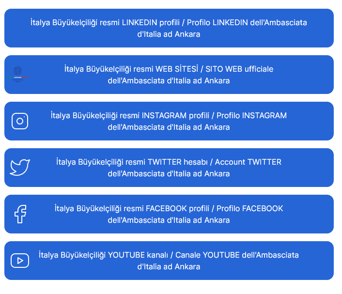 Il link per accedere a tutti i social network dell’Ambasciata attraverso Linktree e’ il seguente: https://linktr.ee/italyinturkiye Si è ritenuto utile l’apertura del profilo anche al fine di valorizzare l’attività delle numerosissime imprese italiane presenti in Turchia, di cui molte dotate di un profilo Linkedin, e per ottenere una maggiore visibilità nel qualificato pubblico turco di investitori. Il numero di utenti turchi sul social network è in costante crescita, raggiungendo ad oggi una “audience size” di oltre 10 milioni di persone.