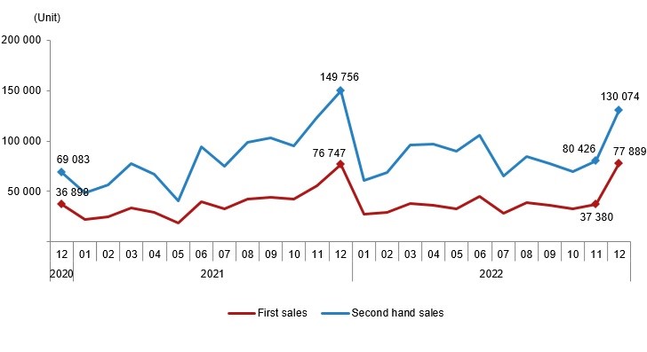 Nel 2022 le case vendute a residenti stranieri sono invece cresciute del 15,2% sul 2021; i contratti di compravendita sono stati 67 mila e cinquecento rispetto ai 58 mila e cinquecento del 2021, con Istanbul che si piazza al primo posto con 25 unità vendute a stranieri seguita dalla città sulla costa mediterranea di Antalya (22 mila) e Mersin (4 mila). Lo scorso anno i cittadini della Federazione russa hanno acquistato 16 mila unità e si collocano al primo posto; un dato che rispecchia come tantissimi russi abbiano cercato un “rifugio” finanziario e non solo in Turchia dopo la guerra russo-ucraina e le successive sanzioni occidentali. L’acquisto di cittadini russi è triplicato rispetto al 2021. I residenti russi sono seguiti a distanza da quelli iraniani (8 mila unità acquistate nel 2022) e dagli iracheni con seimila contratti di compravendita. Si piazzano invece al quarto posto i tedeschi con quasi tremila case acquistate nel 2022, seguiti dagli ucraini (2,500). Nel 2022 le vendite di abitazioni di nuova costruzione sono diminuite dello 0,3% sul 2021 e sono scese a 460 mila con una percentuale sul totale che si attesta al 31%. Anche le vendite di costruzioni di “seconda mano” sono leggermente scese (0,5%) superando il milione di unità vendute in tutto il 2022 che hanno rappresentato il 69% di tutte le tipologie di unità abitative vendute in Turchia: un mercato sostanzialmente costante per tutto il 2022 poiché sostenuto da una domanda di affitti stabile. Una decrescita si è invece registrata nei contratti di compravendita con l’accensione di un mutuo considerando l'elevato debito ipotecario a fronte di un basso reddito per questa tipologia di compravendite che interessa solo il 20% degli acquirenti.
