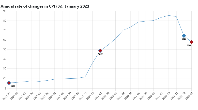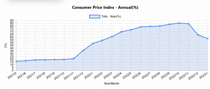 I dati aggiornati al 3 febbraio di TUIK, hanno mostrato a gennaio 2023 un tasso di inflazione che scende al 57,68% annuale rispetto al 64,27% del mese di dicembre. In realtà questa diminuzione è dovuta in buona parte al cd. “effetto base” che deriva dal calcolo (anno-su-anno) basato sul computo statistico dei 12 mesi precedenti. Il tasso di inflazione mese-su-mese da dicembre 2022 a gennaio 2023, infatti, è aumentato del 6,65%. L'inflazione al consumo (CPI) su base annua della Turchia era scesa nel mese di novembre scorso all’84,4% registrando una lieve flessione rispetto al picco storico da 24 anni a questa parte registrato a ottobre 2022 (85,5%).