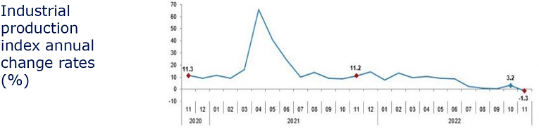 Nel corso dell’ultimo briefing dello scorso 26 gennaio sull’inflazione, il Governatore della Banca Centrale, Şahap Kavcıoğlu, conferma le precedenti stime di fine 2022 che prevedevano un calo più pronunciato nel primo semestre del 2023 per poi “stabilizzarsi” al 22,3% alla fine dell’anno, raggiungendo l'8,8% nel 2024 ed il 5% alla fine del 2025. Kavcıoğlu ha fatto anche fatto riferimento alla strategia della c.d. "liralizzazione" (l’insieme delle misure adottate dal Governo per indurre un incremento dell’uso della moneta nazionale nell’economia turca), che continuerà ad essere il punto centrale della politica monetaria della BCRT. Tale strategia, secondo il Governatore, ha dato alcuni frutti lo scorso anno, se si considera che i depositi in lire turche sono cresciuti dal 35,6% al 55,1% da gennaio a dicembre 2022 e si punta a raggiungere il 60% nella prima metà del 2023 (v.infra). Le riserve ufficiali della BCRT a dicembre 2022 sono aumentate di 17,7 miliardi di dollari raggiungendo un totale di 128,7 miliardi di dollari nel 2022 (+5.2% sul mese precedente di novembre). Tale risultato è stato raggiunto principalmente attraverso due linee d’azione parallele: la prima, è consistita in veri e propri trasferimenti di liquidità in valute convertibili da Paesi terzi quali ad esempio Russia ed Arabia Saudita. La seconda linea d’azione ha previsto invece un drenaggio più intenso di valuta estera e oro dal sistema bancario sotto forma di maggiori obblighi di deposito a garanzia presso la banca centrale per quasi USD 8 mld per le banche nazionali e quasi USD 3 mld per quelle estere, anche per controbilanciare la riduzione della riserva obbligatoria prelevata sui depositi in valuta estera (USD -4 mld), in calo per predetta strategia di “liralizzazione” che ne incentiva la conversione in lire turche con protezione dalle variazioni sfavorevoli del tasso di cambio. Il PIL ha mostrato una buona performance nel primo e nel secondo trimestre del 2022, crescendo rispettivamente del 7,5 e del 7,7%: nel terzo l'economia turca ha dato i primi segni di rallentamento (+6,2%), per poi continuare a decrescere nel quarto trimestre (+3,9%). Alla crescita del Paese nel 2022 ha contribuito in larga parte l’aumento delle esportazioni, cresciute per sette trimestri consecutivi, e gli investimenti in macchinari e attrezzature aumentati del 14,3% su base annua nel terzo trimestre dello scorso anno. Il contributo delle esportazioni e l'aumento degli investimenti in macchinari e attrezzature hanno rappresentato, secondo alcune stime, i 2/3 del tasso di crescita della Turchia nel 2022. La flessione della domanda esterna ha avuto riflessi sulla produzione industriale il cui indice, per la prima volta dal periodo iniziale della pandemia, si è ridotto dell’1,3% su base annua nel mese di novembre 2022 (fonte TurkStat).