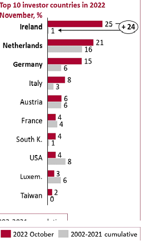 Secondo i dati del mese di novembre 2022, sono ancora una volta i Paesi dell’Unione Europea più il Regno Unito i più importanti investitori in Turchia, detenendo la quota di maggioranza pari all’84% degli IDE totali in entrata nel Paese. l’Italia nel mese in esame passa dalla nona alla quarta posizione con una quota dell’8% dopo le acquisizioni di quote e fusioni di primarie aziende turche nei mesi passati preceduta da Germania (15%), Paesi Bassi (21%) e Irlanda che nel mese in considerazione ha investito nel Paese 236 milioni di dollari pari al 25%. Nel rank riferito ai primi 11 mesi del 2022 la Spagna resta il maggiore investitore con 1,6 miliardi (acquisizioni nel settore bancario) distaccando i Paesi Bassi (819 milioni) e Svizzera e Germania rispettivamente con 688 e 642 milioni di dollari (dati che escludono gli IDE nel settore immobiliare).