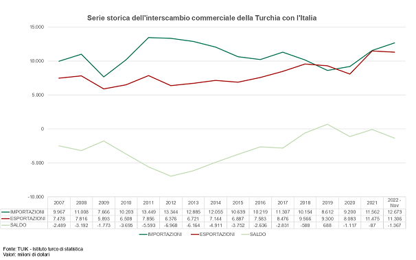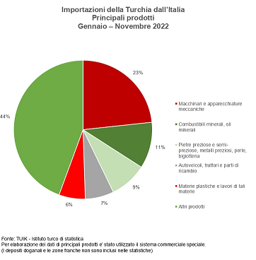 Secondo i dati diffusi dall’Agenzia ICE di Istanbul, nei primi 11 mesi del 2022 - rispetto all’analogo periodo del 2021 - il commercio estero con la Turchia segna un aumento del 15,6% che colloca il l’Italia al 5° posto tra i maggior partner commerciali sfiorando i 24 miliardi di interscambio totale e con una quota del 3,8 del totale importato dalla Turchia. L’Italia in ambito UE si piazza al secondo posto preceduta dalla Germania e prima della Francia mentre nell’area del Mediterraneo è il primo partner commerciale della Turchia.