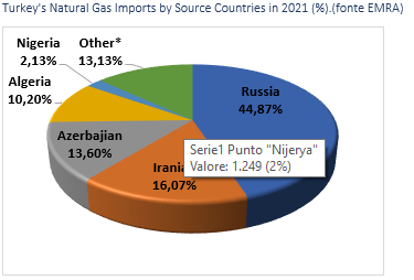 Quanto al consumo interno di gas, la Turchia è passata da 48 miliardi di metri cubi nel 2020 ad un record di 60 miliardi di metri cubi nel 2021 mentre nel 2022 le stime ufficiali indicano un consumo pari a 53,5 miliardi di metri cubi, inferiore rispetto alle precedenti proiezioni di 63 miliardi di metri cubi. Un risparmio reso possibile dall’aumento della quota delle rinnovabili nel “mix” energetico nazionale, che hanno consentito una diminuzione delle importazioni principalmente dalla Federazione Russa (la Turchia dipende dal gas russo per il 44% del proprio fabbisogno).