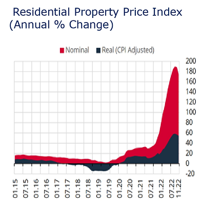Da segnalare l’aumento vertiginoso dei prezzi del mercato immobiliare residenziale nelle città metropolitane della Turchia; secondo il recente report realizzato dalla Knight Frank sul “Global House Price Index” del terzo quarto del 2022, la Turchia ha registrato il massimo incremento annuale del 57,5% collocando il Paese al primo posto.