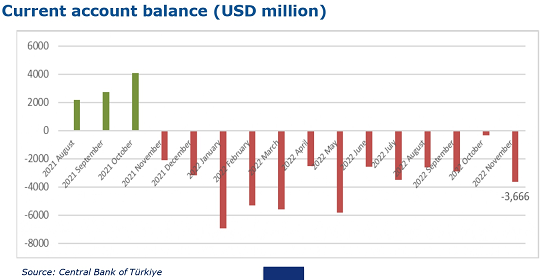 Il deficit delle partite correnti registrato in Turchia è dovuto principalmente all’espansione del saldo della bilancia commerciale: nel mese di novembre 2022 il deficit commerciale della Turchia è stato di 8,7 miliardi di dollari (+60,7% sul mese di novembre 2021) ma nei primi nove mesi del 2022 il deficit ha sfiorato 100 miliardi, con un incremento del 153,4% rispetto analogo periodo del 2021