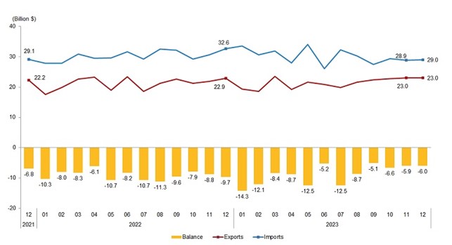 Nel 2023, invece, le esportazioni sono equivalse a USD 255,7 mld (+0,6% rispetto al periodo intercorso tra gennaio e dicembre del 2022), a fronte di importazioni per USD 361,7 mld (-0,5%).