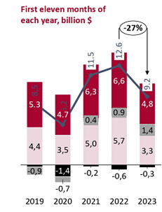 Nel mese di novembre, secondo gli ultimi dati disponibili al 13 gennaio 2024, la bilancia dei pagamenti della Turchia ha registrato un disavanzo del conto corrente, il primo dopo i due avanzi consecutivi nei mesi precedenti, di USD 2,7 mld comunque ridottosi rispetto a USD 4 mld dell’analogo mese del 2022; un calo, di USD 1,3 mld, rispetto all’anno precedente dovuto alla riduzione dei costi dei prodotti energetici importati dalla Turchia. Il disavanzo, nei mesi gennaio-novembre 2023, si attesta a USD 43,6 mld.