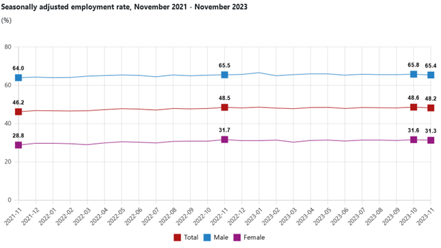 Nel mese in considerazione, si è registrato un tasso di occupazione generale al 48,2% (65,4% per gli uomini e 31,3% per le donne). Il tasso di partecipazione al lavoro, invece, si è attestato al 52,9% (34,7 milioni di persone), in leggero calo rispetto al mese precedente dell’anno. Infine, nel mese in osservazione, le ore lavorate sono state 43,8 rispetto ad una media OCSE di 40,7 ore.