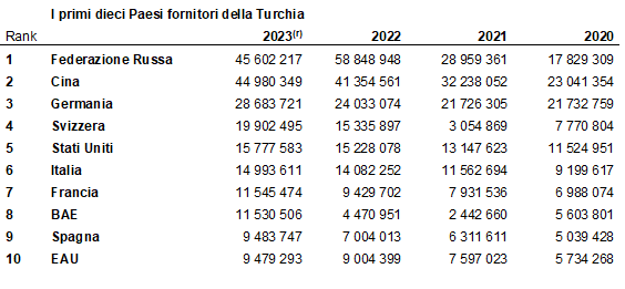 L’interscambio della Turchia con il resto del mondo nel 2023 segnala gli incrementi delle esportazioni turche verso la Svizzera (+74%), gli EAU (+63,6%), e Federazione Russa (+16,9%) mentre sul lato delle importazioni i volumi dagli EAU segnano un +157,9% e quelli dalla Spagna un +35,4% e dalla Svizzera (+29,8%). Calo degli acquisti dalla Russia (-22,5%).