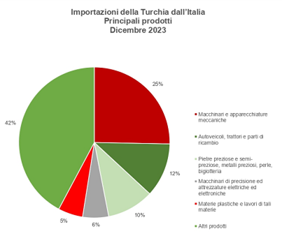 A livello geografico, lo scorso dicembre, i principali mercati di sbocco per le merci turche sono stati Germania (USD 1,679 mld), USA (USD 1,314 mld), Iraq (USD 1,254 mld), Regno Unito (USD 1,217 mld) e Italia (1,22 mld).