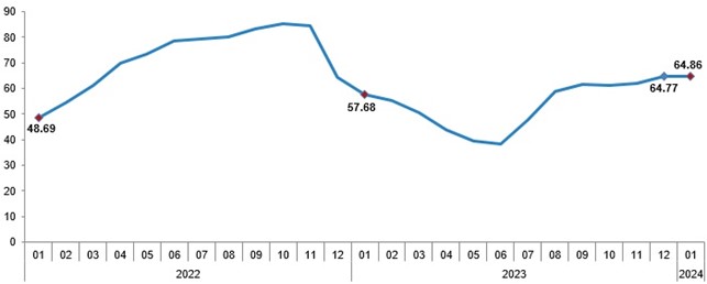 Il 25 gennaio scorso, la Banca Centrale Turca (BCRT) ha annunciato un aumento del tasso di riferimento dal 42,50% al 45% volto a combattere l’inflazione che ha raggiunto il 64,86% a gennaio 2024. Si tratta dell’ottavo aumento consecutivo.