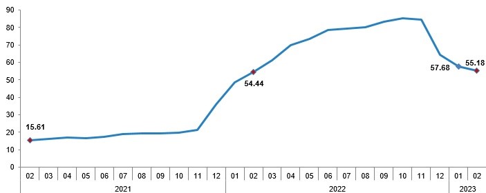 Lo scorso 3 marzo, i dati aggiornati di TUIK hanno mostrato per il mese di febbraio un tasso di inflazione che si è attestato al 55,18% su base annua (+3,15% mese su mese) rispetto al 57,68% del mese di gennaio scorso. L'inflazione al consumo (CPI) su base annua era scesa nel mese di novembre scorso all’'84,4% registrando una lieve flessione rispetto al picco massimo (mai registrato negli ultimi 24 anni) del mese di ottobre 2022 (+85,5%) per poi scendere al 64,3% a dicembre scorso.