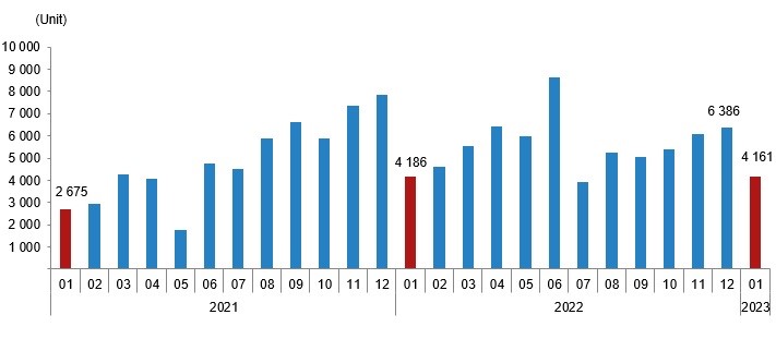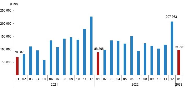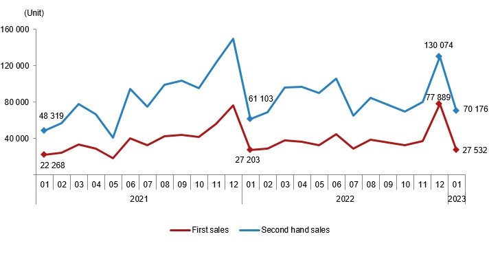 In calo le abitazioni acquistate con finanziamenti (-10,9% sul solo mese di dicembre 2022); più sensibile invece il calo registrato a gennaio 2023 sia degli acquisti di immobili nuovi (27.500) che di quelli di seconda mano (70.176) rispetto a dicembre 2022.