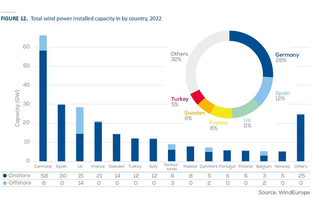La Turchia rafforza la sua posizione nel panorama dell’energia eolica, collocandosi al 6° posto in Europa per capacità di potenza installata, secondo il rapporto "2022 European Wind Statistics and 2023-2027 Outlook" dell'Associazione europea per l'energia eolica, WindEurope.