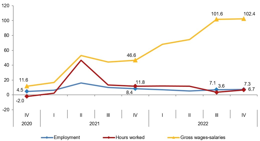 Infine, l'indice lordo dei salari è aumentato del 102,4% nel trimestre ottobre-dicembre 2022 rispetto al medesimo trimestre dell’anno precedente, facendo registrare un +15,1% sul trimestre luglio-settembre 2022 quando l’indice registrò un +24,9%.