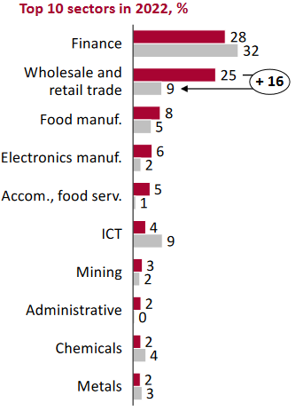 Nel 2022, il settore “servizi”, in particolare bancario e assicurativo, hanno fornito il più grande contributo agli IDE in entrata nel 2022 (28% del totale), seguito da quello delle “vendite all’ingrosso e commercio al dettaglio” (25%) mentre a distanza, al terzo posto, si è piazzato il settore manifatturiero e del “food & beverage e tobacco”.