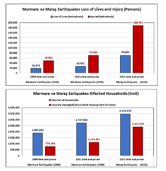 Tenendo presente gli evidenti diversi impatti sull’economia dei due terremoti a Marmara e Kahramanmaraş che hanno avuto la stessa magnitudo, TÜRKONFED paragona i danni causati dalle due catastrofi e l’impatto finanziario. Il sisma di Kahramanmaraş (il distretto più colpito con oltre 30 mila di km2) ha riportato, ad oggi, molte più vittime rispetto alle 18 mila di quello di Marmara, con un area del sisma estesa 15.000 chilometri quadrati ed un danno finanziario stimato in 17 miliardi di dollari. TÜRKONFED stima invece che i danni del terremoto del 6 febbraio raggiungano gli 84 miliardi di dollari. Si è trattato di una prima valutazione “a caldo” realizzata a breve distanza dal sisma. Si tratta tuttavia di uno studio piuttosto approfondito la cui metodologia si basa su un confronto scientifico dei dati dei due terremoti (Marmaris e Kahramanmaras). I circa 84 miliardi di dollari comprendono 70,75 miliardi per la ricostruzione degli edifici collassati (il costo medio calcolato di un'unità abitativa di 100 mq è pari a 27 mila e cinquecento dollari); 10,4 miliardi di minori introiti sul reddito nazionale e quasi 3 miliardi di dollari per le giornate lavorative perse.