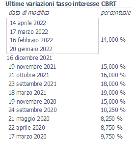 Nella dichiarazione della CBRT, al termine della riunione dell’MPC, è stato affermato che la decisione di mantenere invariato il tasso ufficiale di riferimento è stata presa poiché le aspettative di un "processo di disinflazione" non tarderebbero a manifestarsi; nel frattempo però il tasso di inflazione in Turchia è salito 61,14% nello scorso mese di marzo dal 54,4% di febbraio scorso (era al 16,19% nel marzo 2021), il livello più alto da due decenni, sospinto dagli incessanti rincari dei consumi energetici (nel settore energetico l’inflazione è cresciuta al 76% dal 43% da dicembre 2021 a gennaio 2022) e dei prezzi delle materie prime alimentari e agricole; le aspettative resterebbero negative anche per i prossimi mesi. I dati più recenti pubblicati lo scorso aprile sono ancora peggiori: il tasso di inflazione si attesterebbe infatti al 70%.