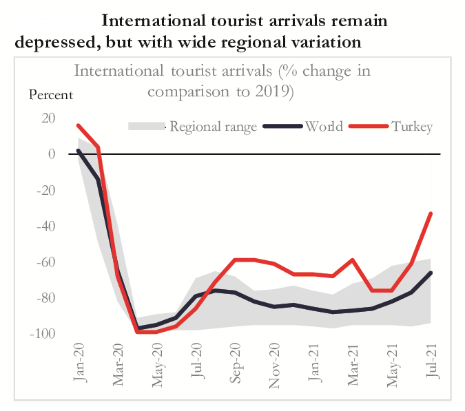 Nel frattempo, secondo le prime stime del dell'Associazione degli albergatori turchi (TÜROB), il flusso turistico è in netta ripresa nelle grandi città, nelle province nord-occidentali di Yalova e Bursa e nelle località costiere della Turchia (in cima la città costiera mediterranea di Antalya, Muğla e di Izmir sulla costa egea).