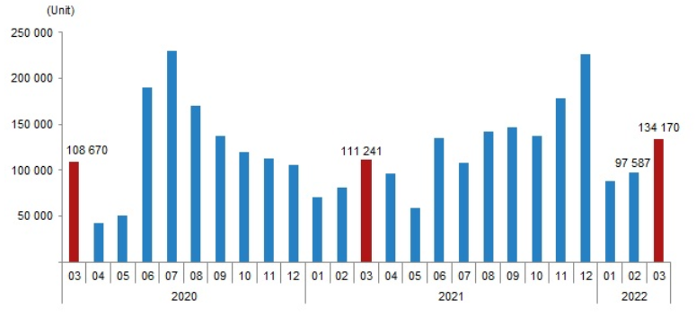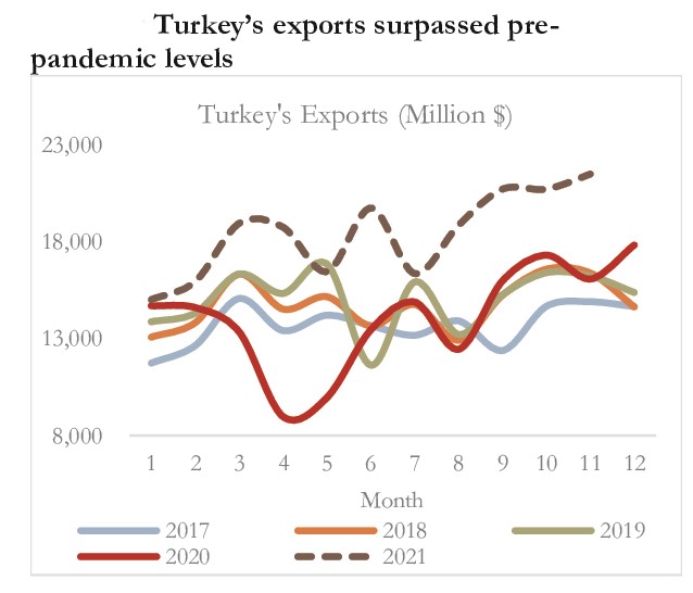 Le esportazioni turche sono aumentate del 19,8% a marzo 2022 attestandosi in un solo mese a 22,7 miliardi di dollari, secondo i dati provvisori diffusi lo scorso mese di aprile dal Ministero del Commercio. Le importazioni nell’analogo periodo sono aumentate del 31%. L'aumento delle importazioni, soprattutto energia e metalli, è stato pari quasi al doppio rispetto a quello delle esportazioni, e il deficit commerciale nel primo trimestre del 2022 è stato di 26,4 miliardi di dollari.