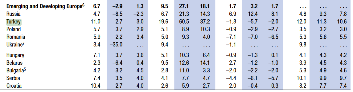 Come si evince dal grafico dell’International Monetary Fund (annual % change), dopo un 2021 che ha collocato la Turchia al primo posto tra i Paesi emergenti - e nel mezzo della pandemia da COVID-19 - per crescita del PIL (+11%) seguita da Croazia e Ungheria, le stime per il 2022 di tutti i Paesi della medesima categoria della Turchia sono state riviste tutte al ribasso.