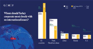 Secondo il recente sondaggio "Turkish Perceptions of the European Union" condotto dal think tank di politica estera GMF con sede negli States, su un campione di 2.180 intervistati di età adulta, il 33,1% dei partecipanti ha affermato che la Turchia dovrebbe collaborare più strettamente con l'UE sulle questioni internazionali. I paesi dell’Unione Europea sono seguiti a distanza dalla Russia con il 5,6%, la Cina con il 6,8% e gli Stati Uniti con il 4,7%. Nella fascia di età 18-24 si registra la percentuale più alta che raggiunge (44% del campione). Il 24,6% degli intervistati ha invece espresso opinioni contrarie a collaborazioni più strette con l’Ue, percentuale cresciuta rispetto al 15,9% che si era registrato nella precedente indagine condotta nel 2021.