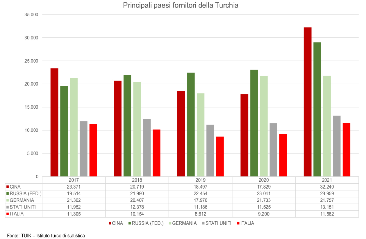 Nei primi due mesi del 2022 il trend caratterizzato nel 2021 si ripete con un aumento delle vendite turche in soli due mesi di quasi 40 miliardi di dollari e, nell’analogo periodo, acquisti pari a 56 miliardi di dollari quindi con un leggero disavanzo commerciale della Turchia. Tornando al 2021, tra i principali Paesi esportatori troviamo al primo posto la Cina con più di 32 miliardi di dollari seguita dalla Russa (con quasi 30 miliardi), Germania (22 miliardi), USA (13 miliardi) e Italia (12 miliardi) che precede a lunga distanza Francia e India (8 miliardi), la Corea del Sud 7,5 miliardi) e Spagna e UK rispettivamente con 6 e 5,5 miliardi di dollari di merci vendute alla Turchia nel 2021.