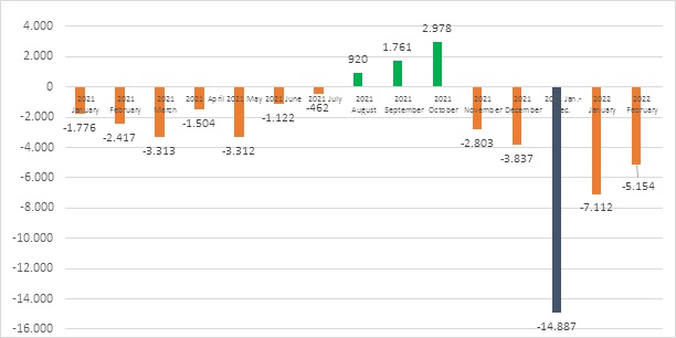 Il saldo delle partite correnti della Turchia ha registrato un disavanzo di 5,15 miliardi di dollari nello scorso mese febbraio (più del doppio rispetto al febbraio del 2021) secondo i recenti dati ufficiali pubblicati dalla Banca Centrale. La CBRT ha affermato che il deficit delle partite correnti “anno su anno” della Turchia, sempre nel mese di febbraio 2022, si è attestato a 21,84 miliardi di dollari. Uno squilibrio della bilancia dei pagamenti dovuto, oltre che agli effetti della crisi Ucraina che ha aumentato le importazioni di prodotti energetici del Paese ampliando il deficit commerciale, anche dalla forte espansione del credito voluta dal Presidente Erdogan attraverso una politica di tassi di interesse bassi, costantemente al di sotto del livello di inflazione. Allo stesso tempo le riserve ufficiali sono diminuite di 2,2 miliardi di dollari lo scorso mese di febbraio dopo essere state sensibilmente prosciugate alla fine del 2021 Il deficit cronico della bilancia dei pagamenti, come si evince dal grafico, inizia nell’ottobre dello scorso anno e nel 2021 è stato pari a 15 miliardi di dollari. Escludendo l’oro e i prodotti energetici, il saldo delle partite correnti ha invece registrato un surplus di poco superiore ai 2 miliardi di dollari nel mese in oggetto rispetto ai 624 milioni di dollari nell’analogo periodo del 2021.