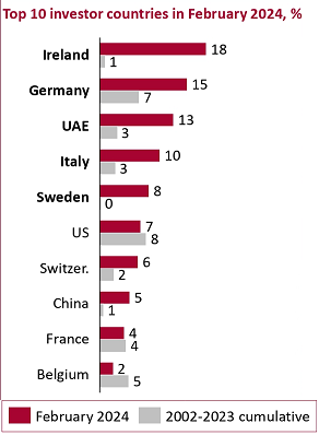 Nel mese di febbraio 2024, con una quota pari al 59% del totale degli IDE, i Paesi UE complessivamente considerati si sono confermati i principali investitori in Turchia.
