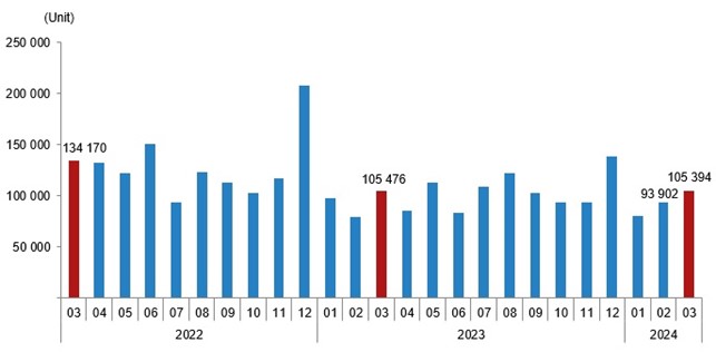 Nel mese di marzo 2024, rispetto allo stesso mese del 2023, è continuato il calo generalizzato degli acquisti con finanziamento (-49%); gli acquisti di alloggi nuovi e di seconda mano hanno invece fatto registrare aumenti rispettivamente del 4,6% e del 2,2%, incrementi che salgono invece al 5,2% e al 4% nei mesi gennaio-marzo 2024 se confrontati con il primo trimestre dello scorso anno.