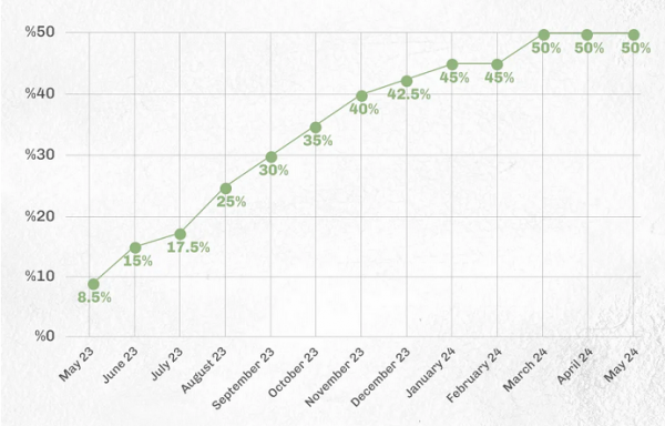 Il 23 maggio scorso, la BCRT ha comunicato il mantenimento del tasso di interesse al 50% per il secondo mese consecutivo.