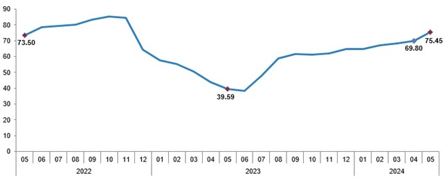 I dati pubblicati lo scorso 3 giugno da Turkstat certificano che l'inflazione dei prezzi al consumo (CPI) è cresciuta a maggio del 3,37% rispetto al mese precedente passando dal 69,80 al 75,45% su base annua.