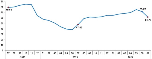 I dati pubblicati lo scorso 5 agosto da Turkstat certificano che l'inflazione dei prezzi al consumo (CPI) su base mensile è cresciuta a luglio del 3,23% (in aumento rispetto al mese precedente, quando si era attestata al +1,64%). L’inflazione su base annua si è invece ridotta a giugno passando dal 71,60% al 61,78%.