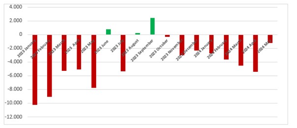 Nel primo semestre del 2024 è stato registrato un deficit complessivo di USD 42,6 mld, in diminuzione del 30,5% se comparato all’analogo semestre del 2023.