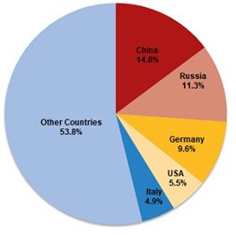 Per quanto riguarda le importazioni, i principali Paesi fornitori sono stati: Cina (USD 28,6 mld), Federazione Russa (25,3 mld), Germania (17,6 mld), Stati Uniti (9,9 mld) e Italia (9,5 mld).