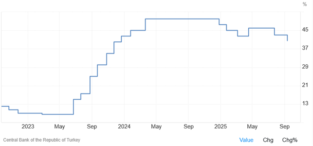 Il Comitato di Politica Monetaria (CPM) della Banca Centrale della Repubblica di Turchia (BCRT) ha deciso di ridurre il tasso ufficiale di riferimento dal 43% al 40,5%.