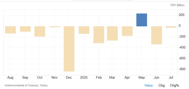 Secondo i dati diffusi dal Ministero del Tesoro e delle Finanze, nel mese di luglio 2025 è stato registrato un disavanzo di bilancio pari a TL 23,9 miliardi (circa 584,4 milioni di dollari rispetto agli 8,1 miliardi del mese precedente).