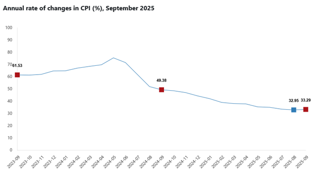 L’inflazione su base annua si è attestata al 33,29%, in aumento rispetto al 32,95% di agosto. Si tratta del primo incremento del tasso negli ultimi sedici mesi.