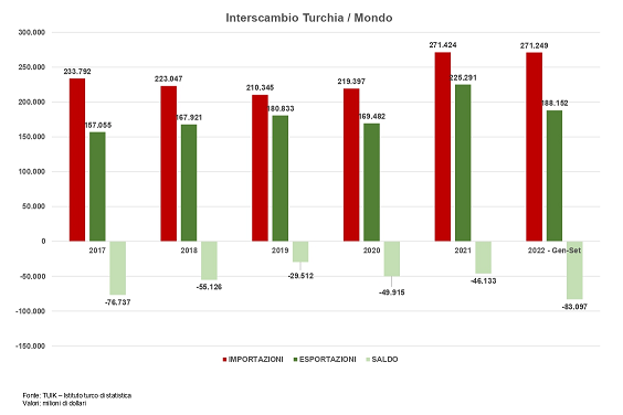 Tornando ai numeri, nei primi nove mesi del 2022 le esportazioni sono state pari a 188,2 miliardi di dollari (+17%) mentre l’import si è attestato a 271,3 miliardi (+40,4%) rispetto allo stesso periodo dello scorso anno. Nel complesso l’interscambio totale ha registrato un aumento del 29,8% passando da 354 a 459,4 miliardi di dollari mentre il deficit della bilancia commerciale della Turchia è salito a 83 miliardi di dollari; in aumento le importazioni di oro (+543%).